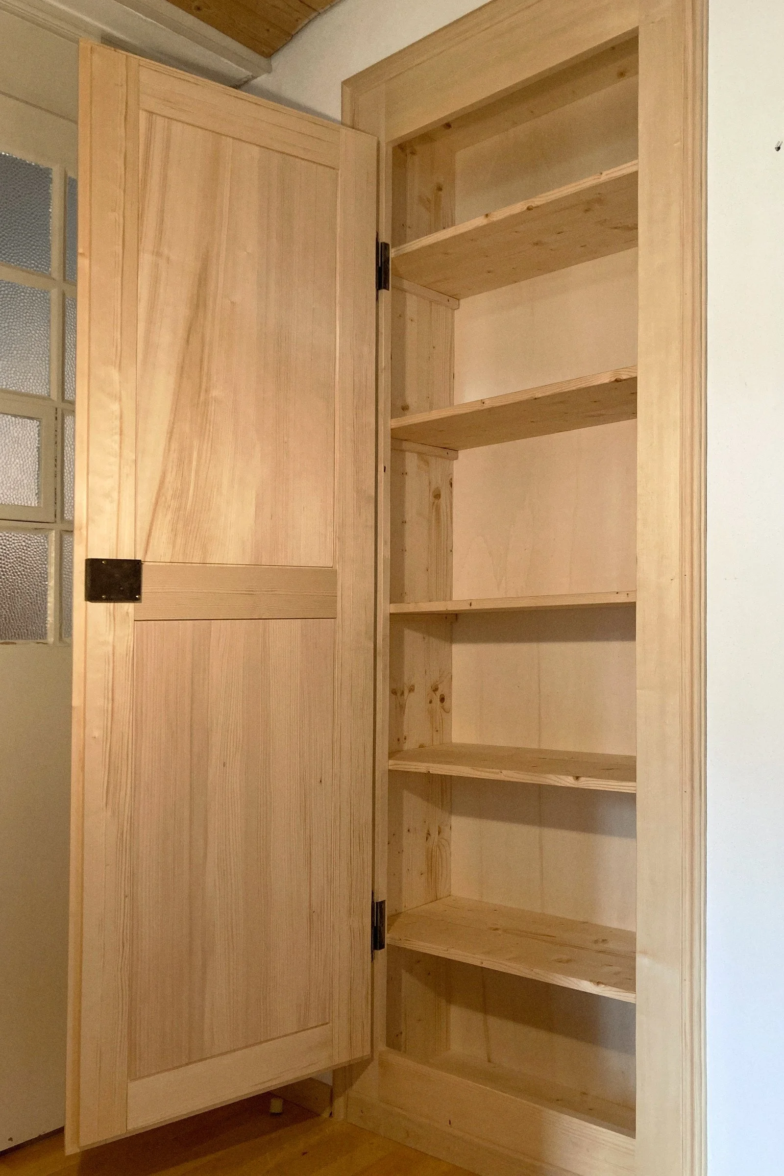 Schrank mit gestemmter Tür und Fries aus CH-Weisstanne in bestehende Nische eingebaut.